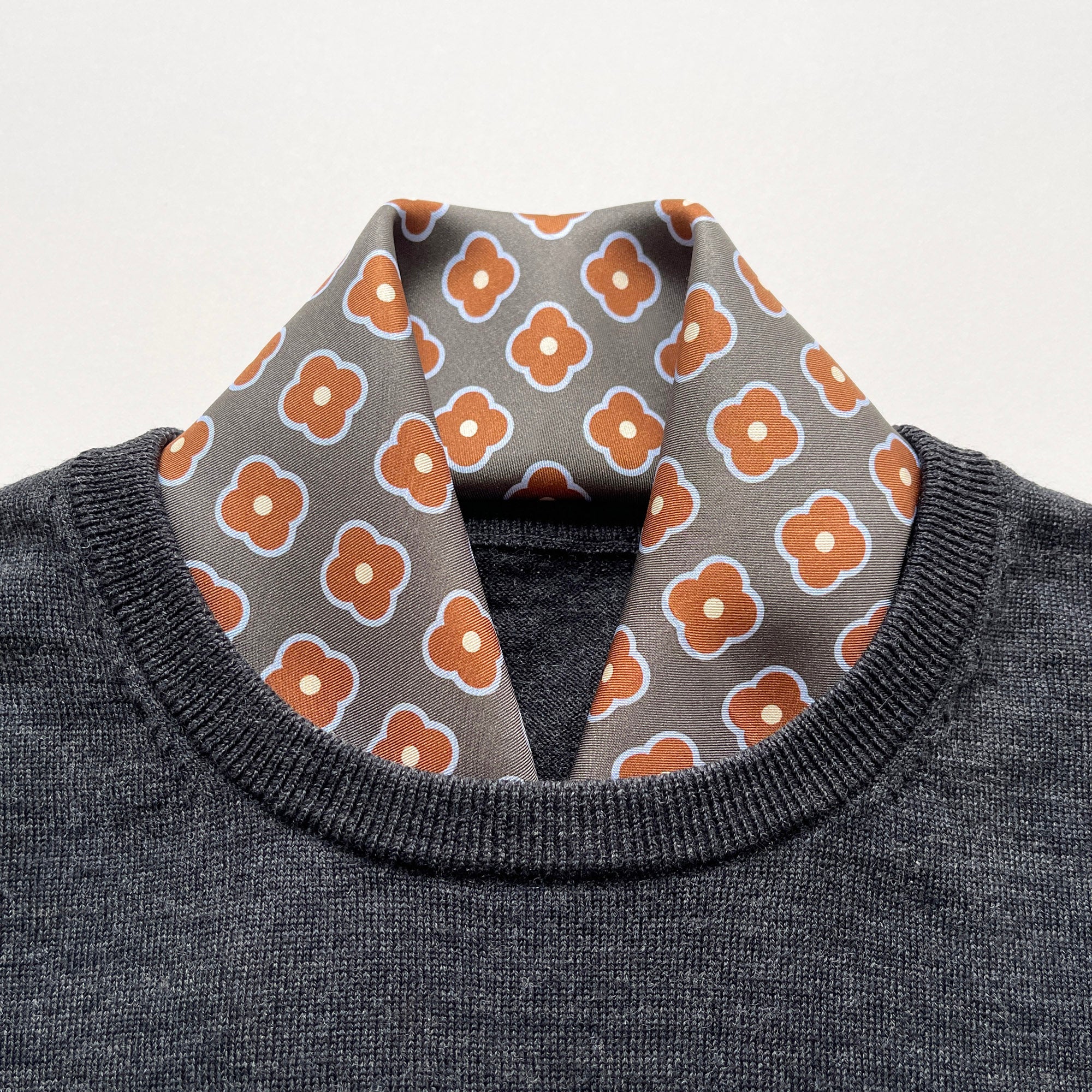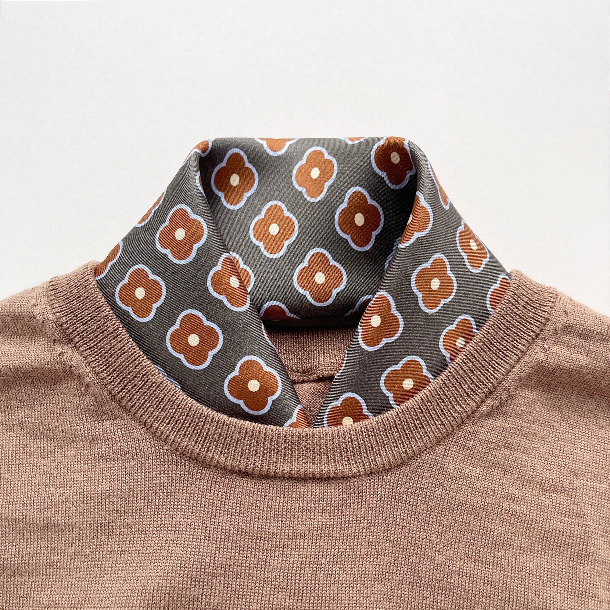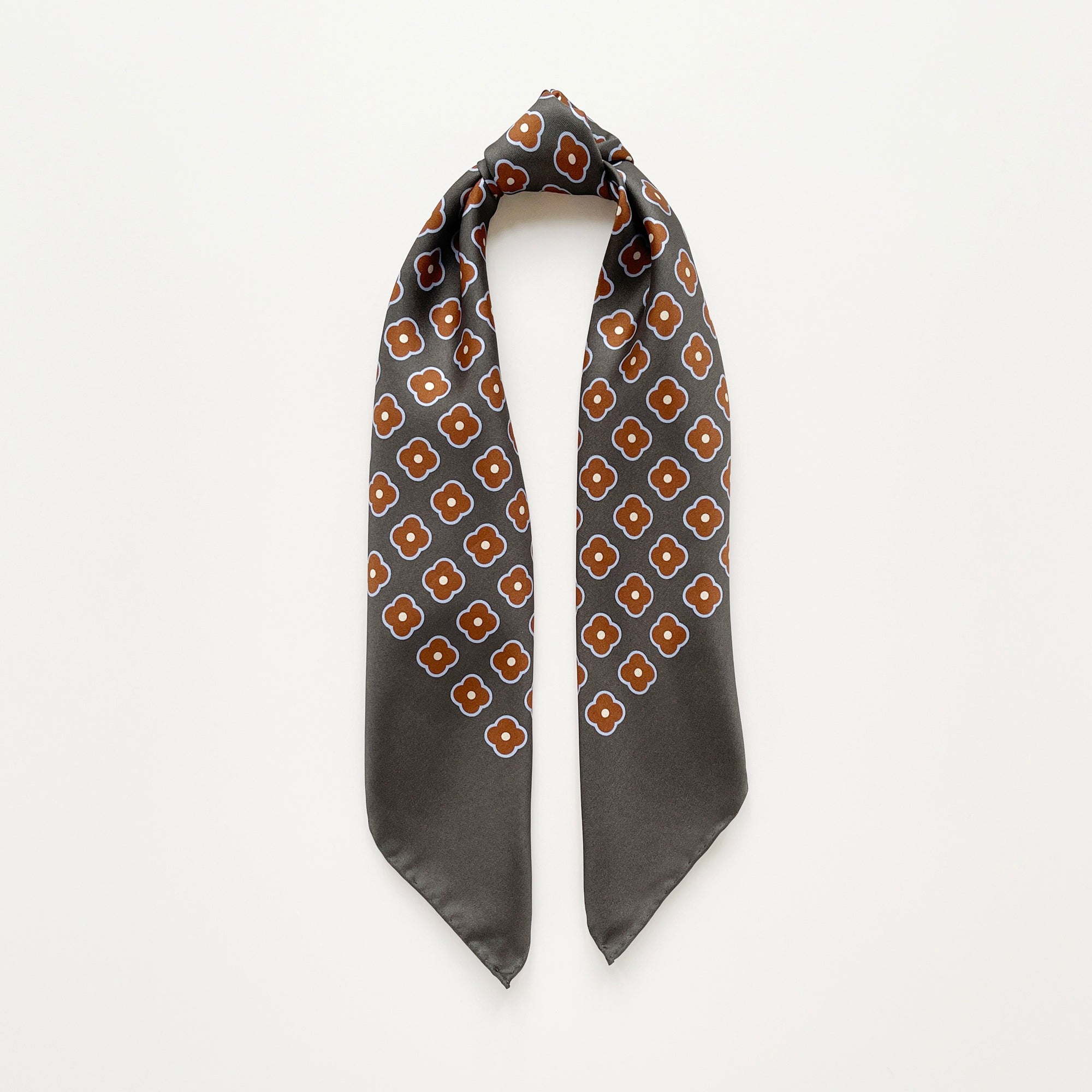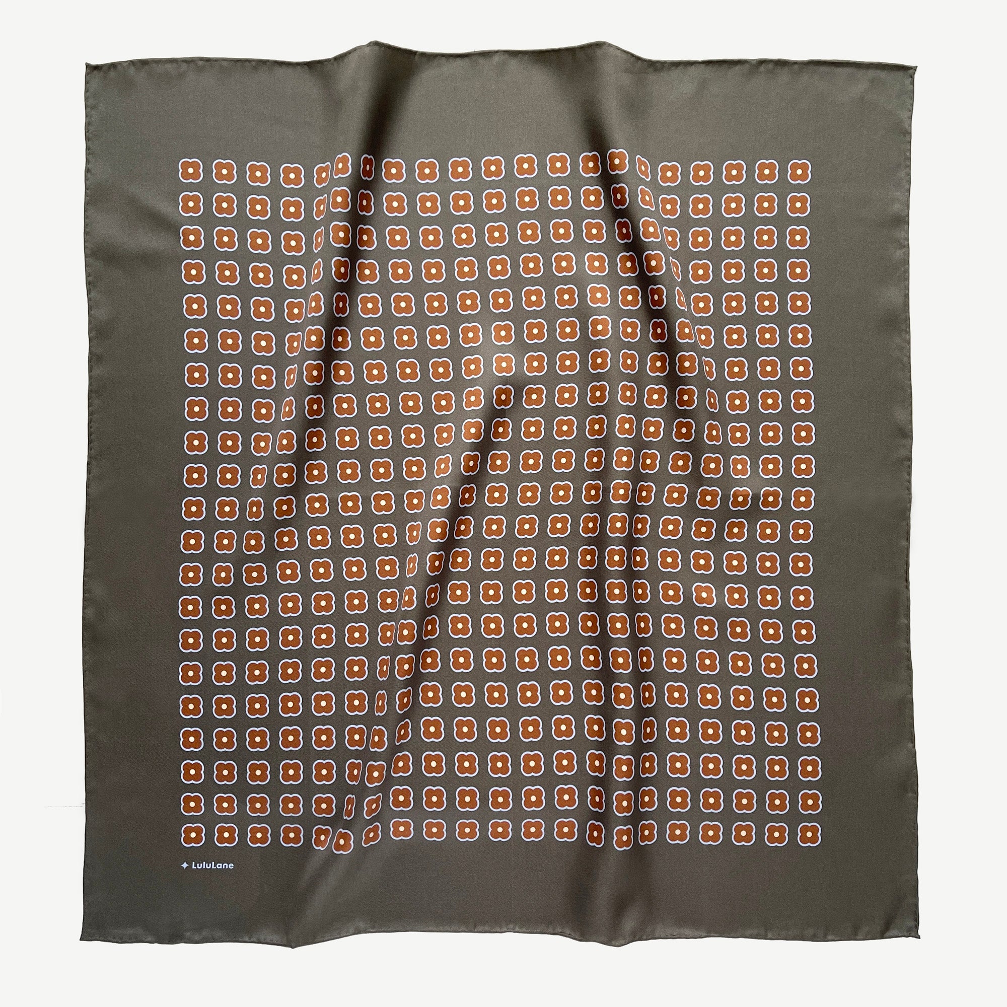 Add a touch of modern elegance to your wardrobe with this 65cm silk twill square scarf, featuring a clean and graphic four-petal flower motif repeated in a neat, contemporary layout. Printed double-sided for richer colour and versatility, it looks polished from every angle—whether worn around the neck, styled as a bandana, or tied to a bag.