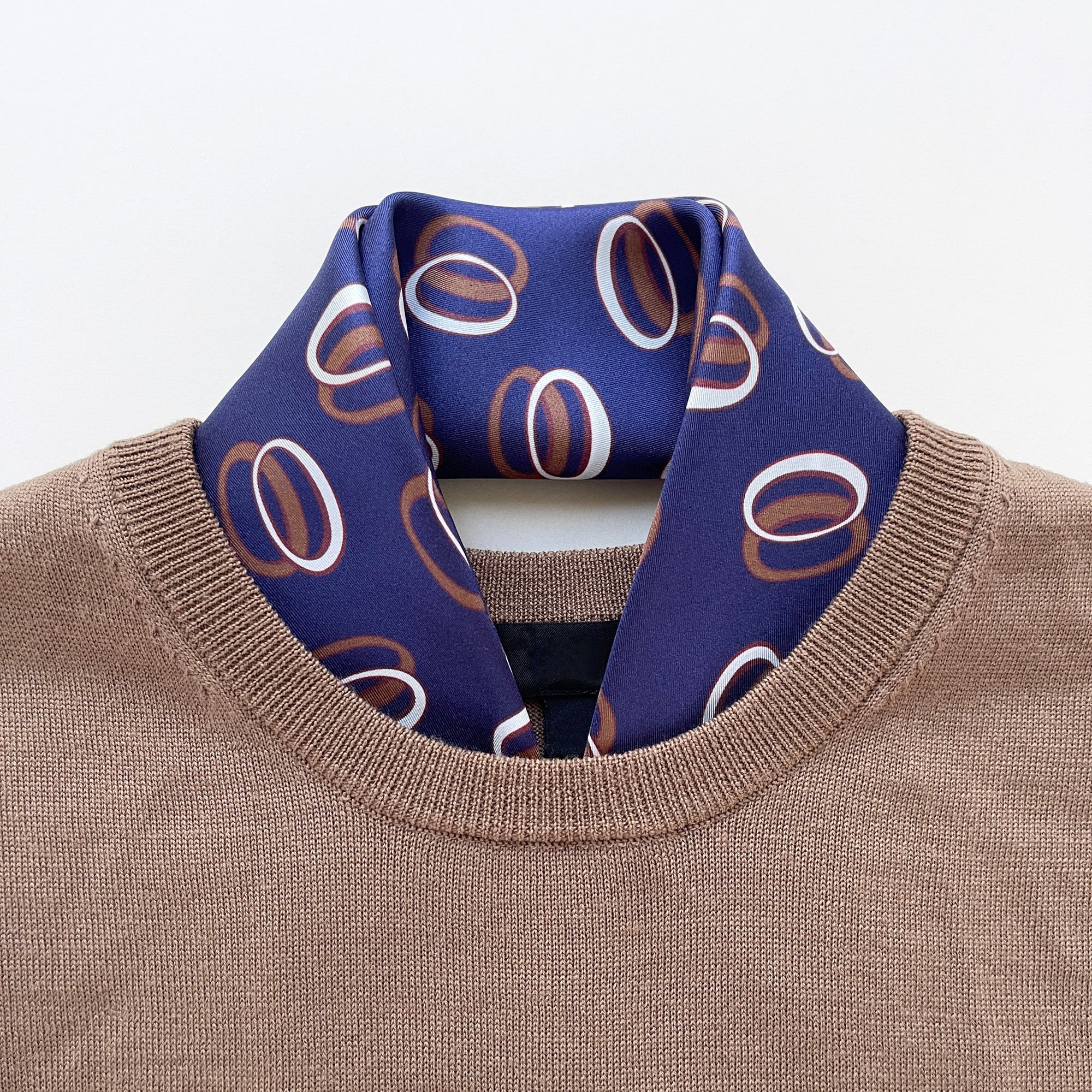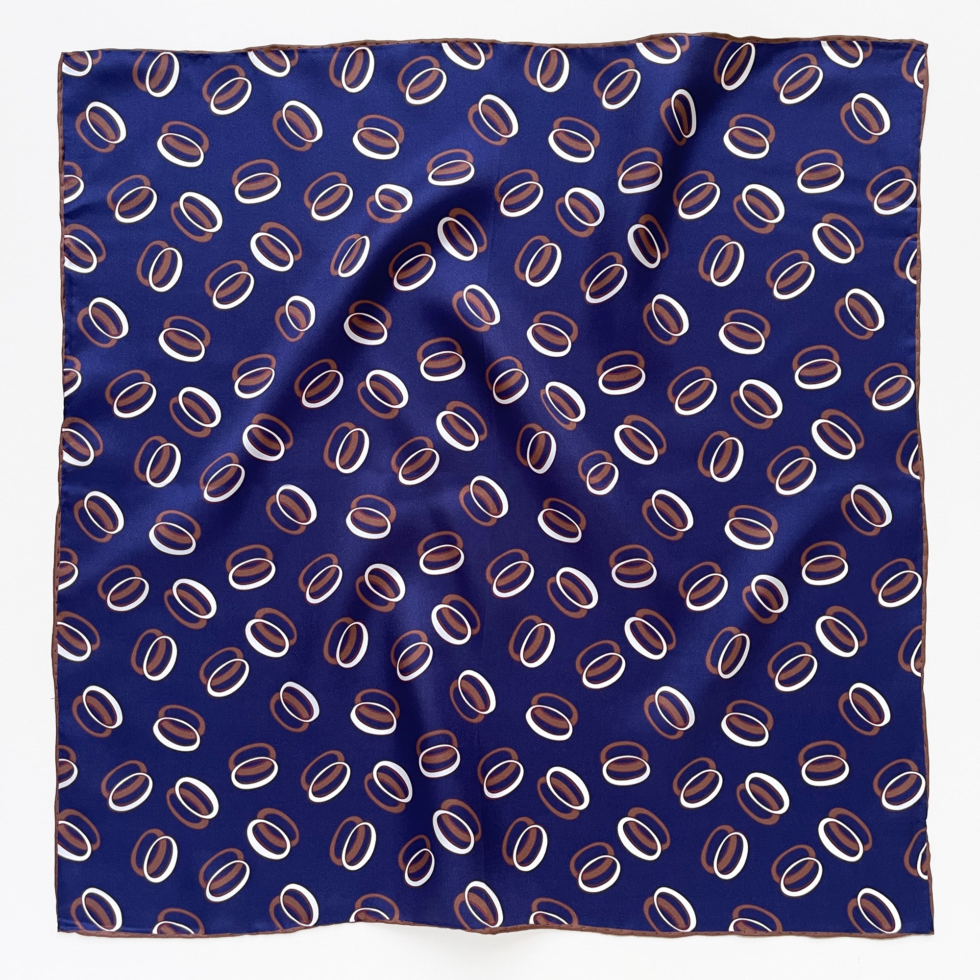 Enhance your wardrobe with this luxurious unisex silk bandana scarf, designed for both men and women. Crafted from 100% premium silk twill, this scarf showcases a striking circular pattern against a rich indigo purple background, making it a versatile statement piece for any outfit - whether styling as a neck scarf, headband, or tied to your favorite bag.