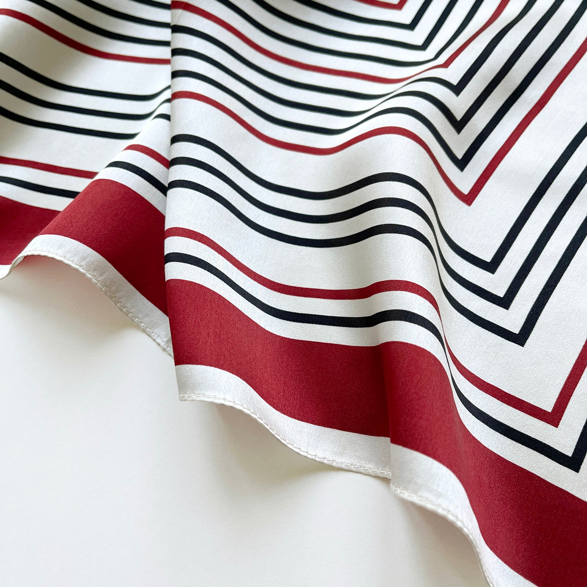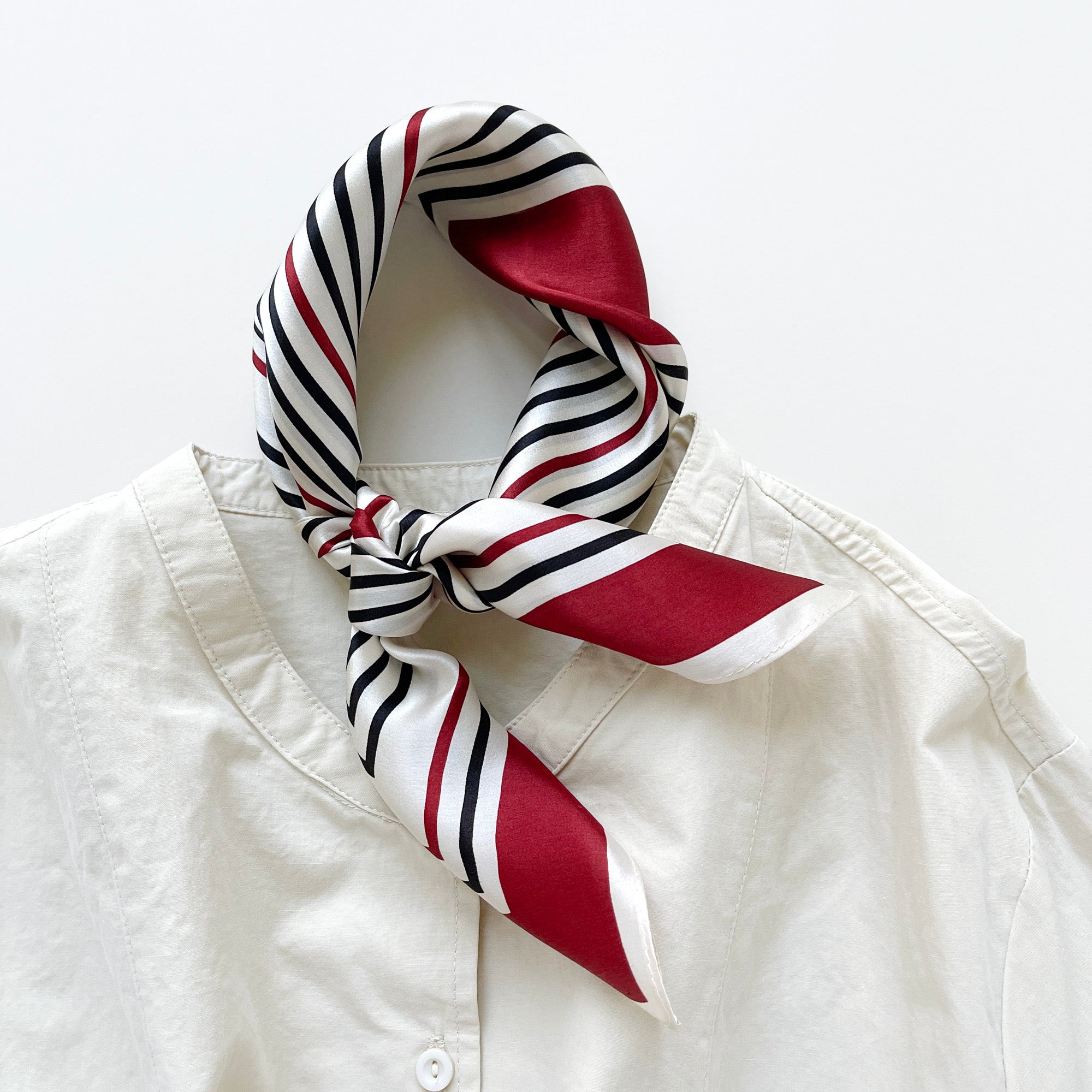 Elevate your wardrobe with this luxurious 100% silk bandana scarf, designed to bring sophistication and versatility to your everyday style. Featuring a timeless geometric pattern in striking red, beige, and navy on an off-white base, this square silk scarf is perfect for adding a touch of elegance to any outfit. Its lightweight and smooth silk material feels ultra-soft against the skin, making it a comfortable and stylish choice for any season.