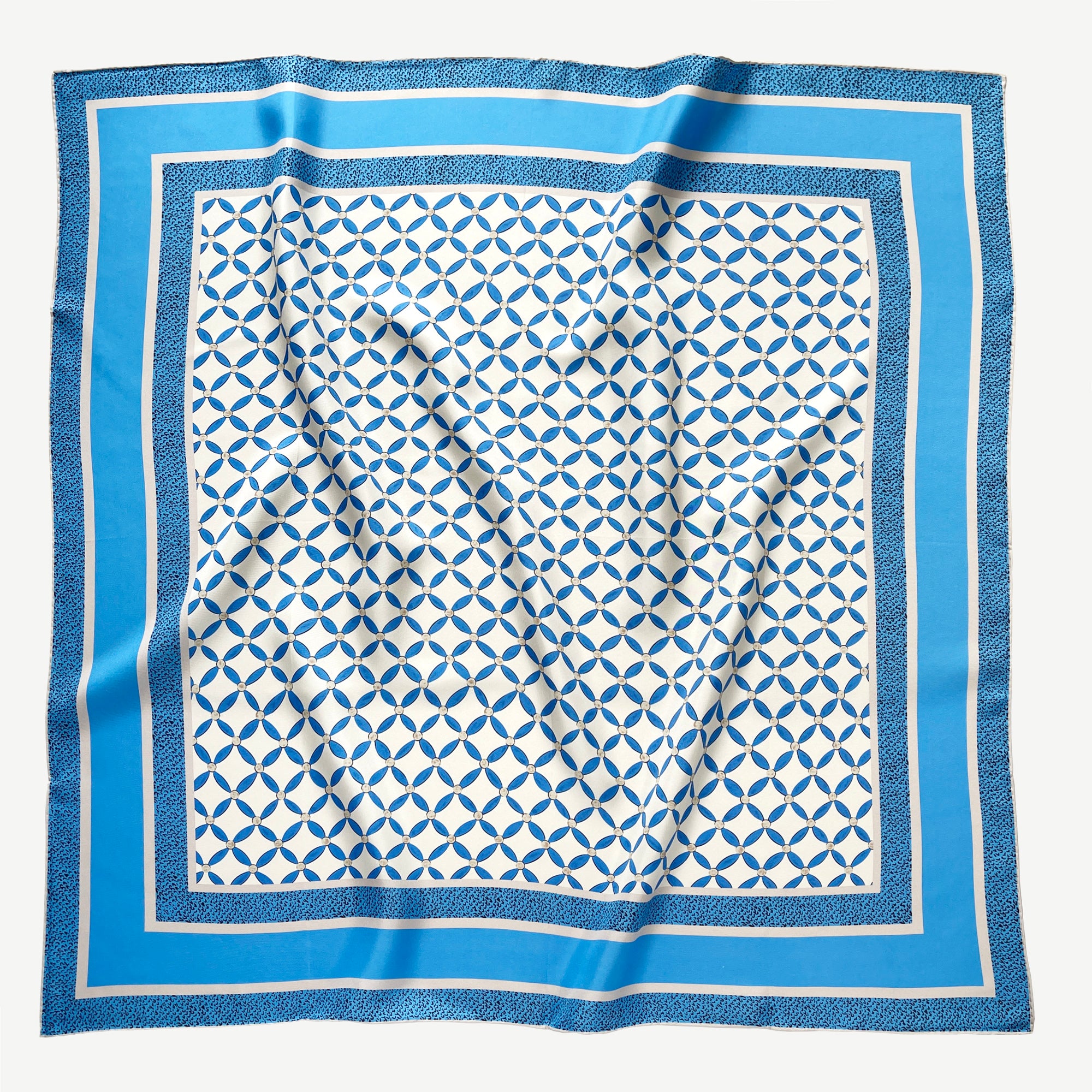 Add a pop of modern elegance to your wardrobe with this 100% silk twill scarf, designed in a refreshing blue and light grey palette. Featuring a delicate petal-like geometric motif and bold striped borders, this square scarf is printed on both sides for added styling flexibility.