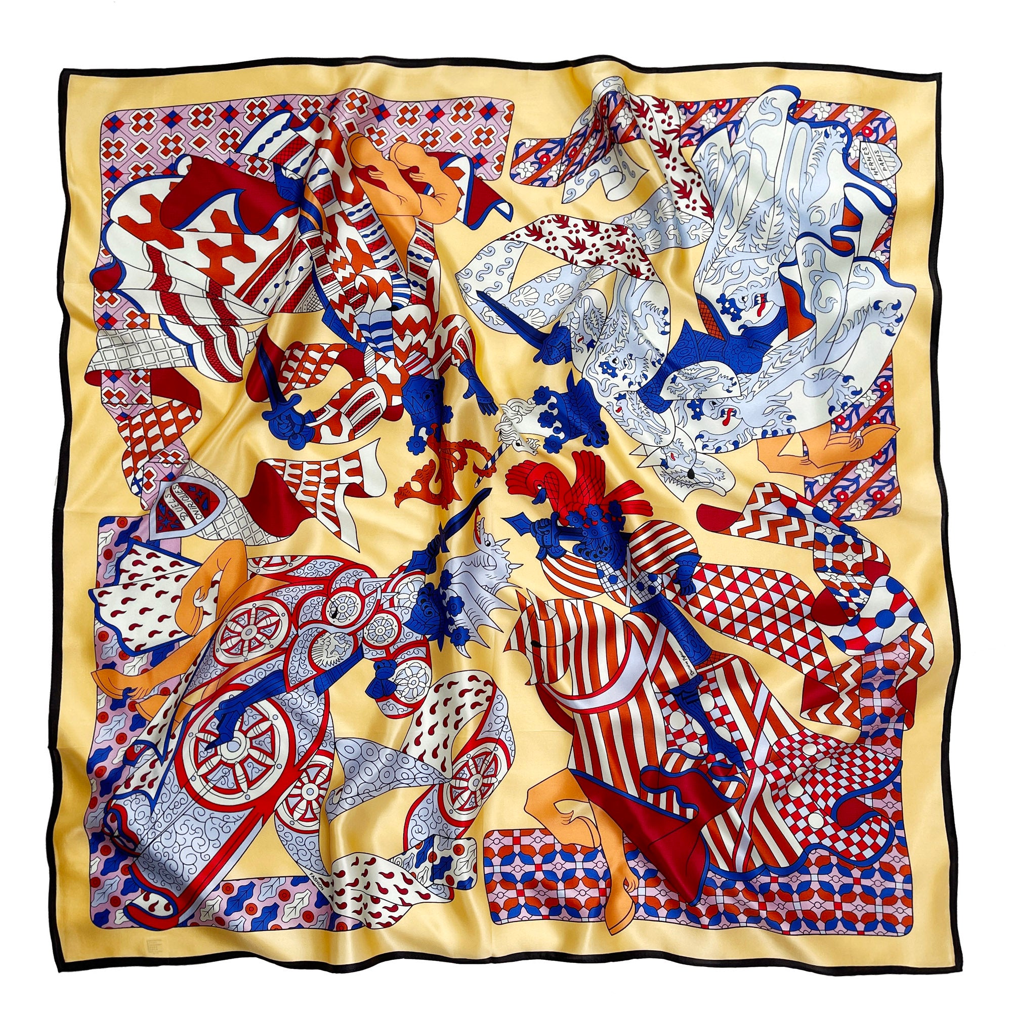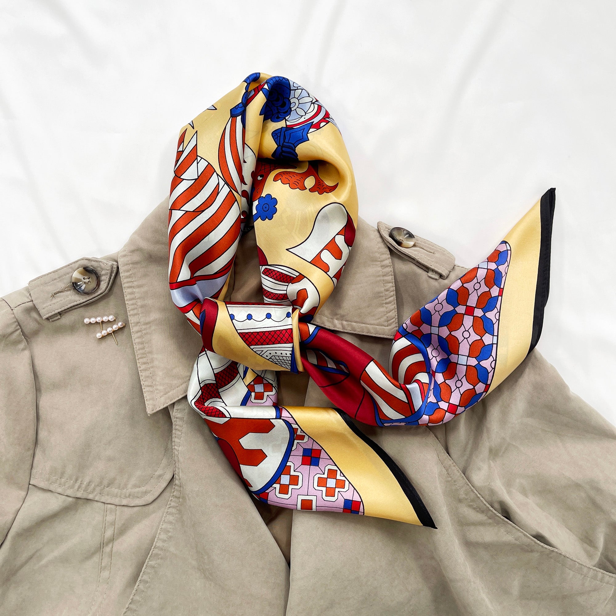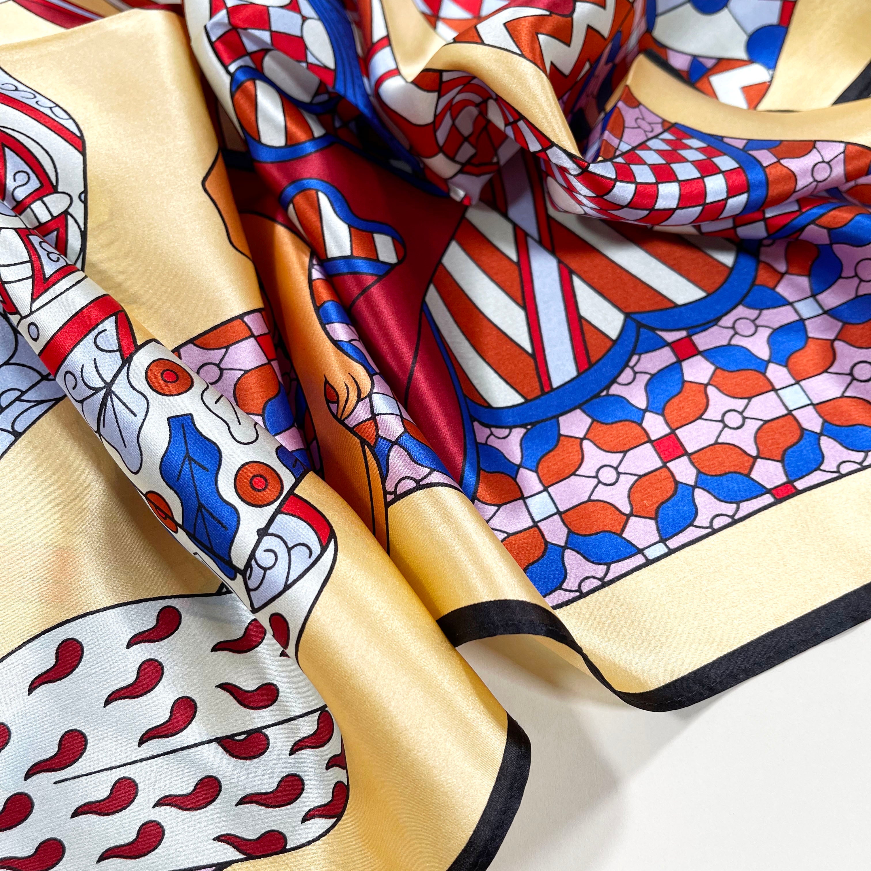 Enhance your accessories with our 90cm classic silk square scarf exclusively for women. This luxurious scarf is made of 100% premium silk and features a beautiful pale yellow, red and blue palette with a classic decorative pattern. It adds sophistication and charm, perfect for any outfit.