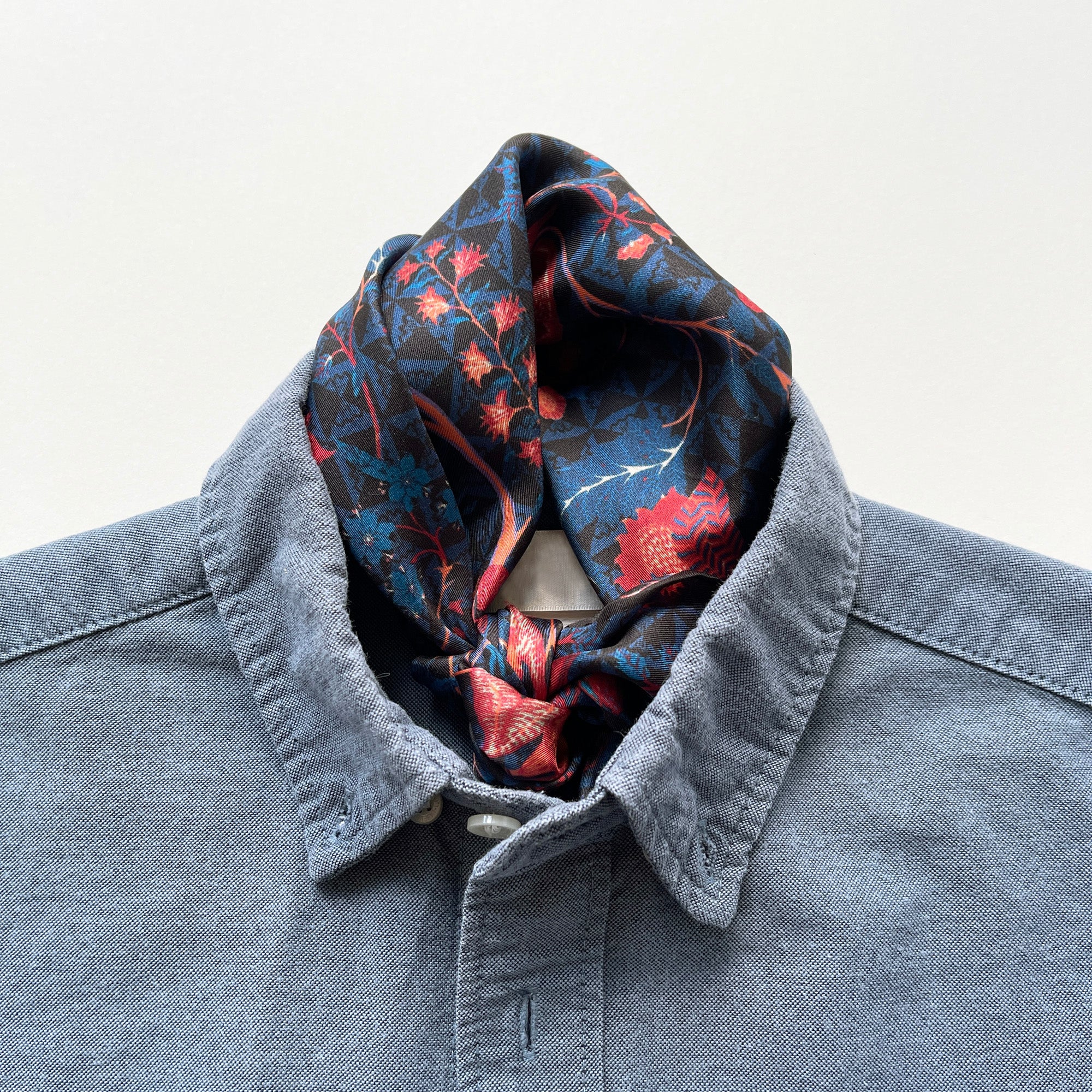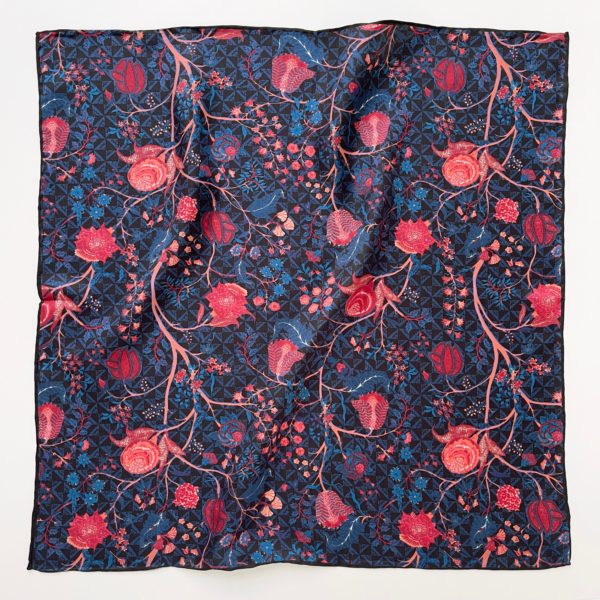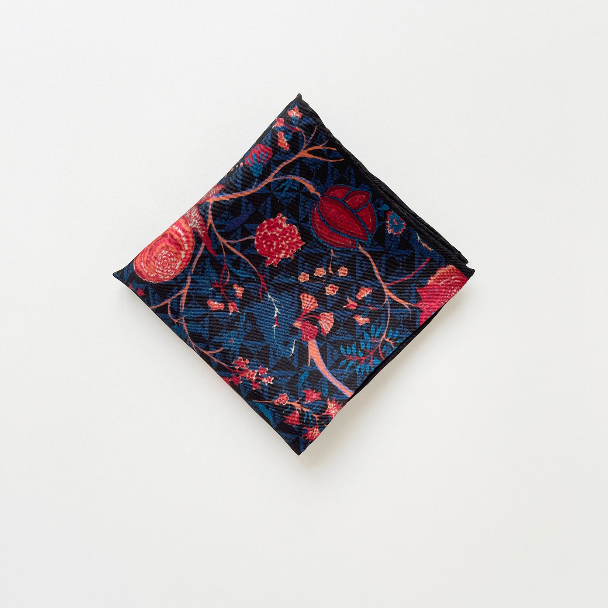 Add an elegant touch to your wardrobe with this stunning floral silk bandana scarf, meticulously crafted from 100% luxurious silk twill. Its deep navy blue base features a vibrant floral design in shades of red and pink, perfect for both men and women seeking a sophisticated and versatile accessory. The hand-rolled edges showcase the artisanal quality and attention to detail, ensuring a refined finish.
