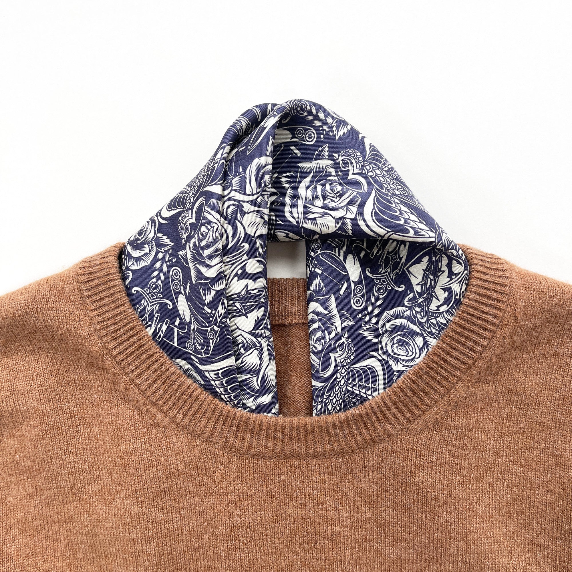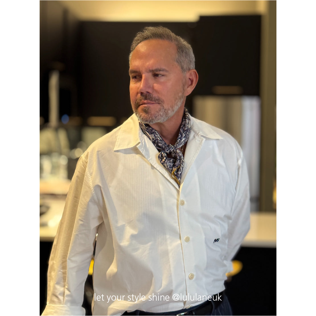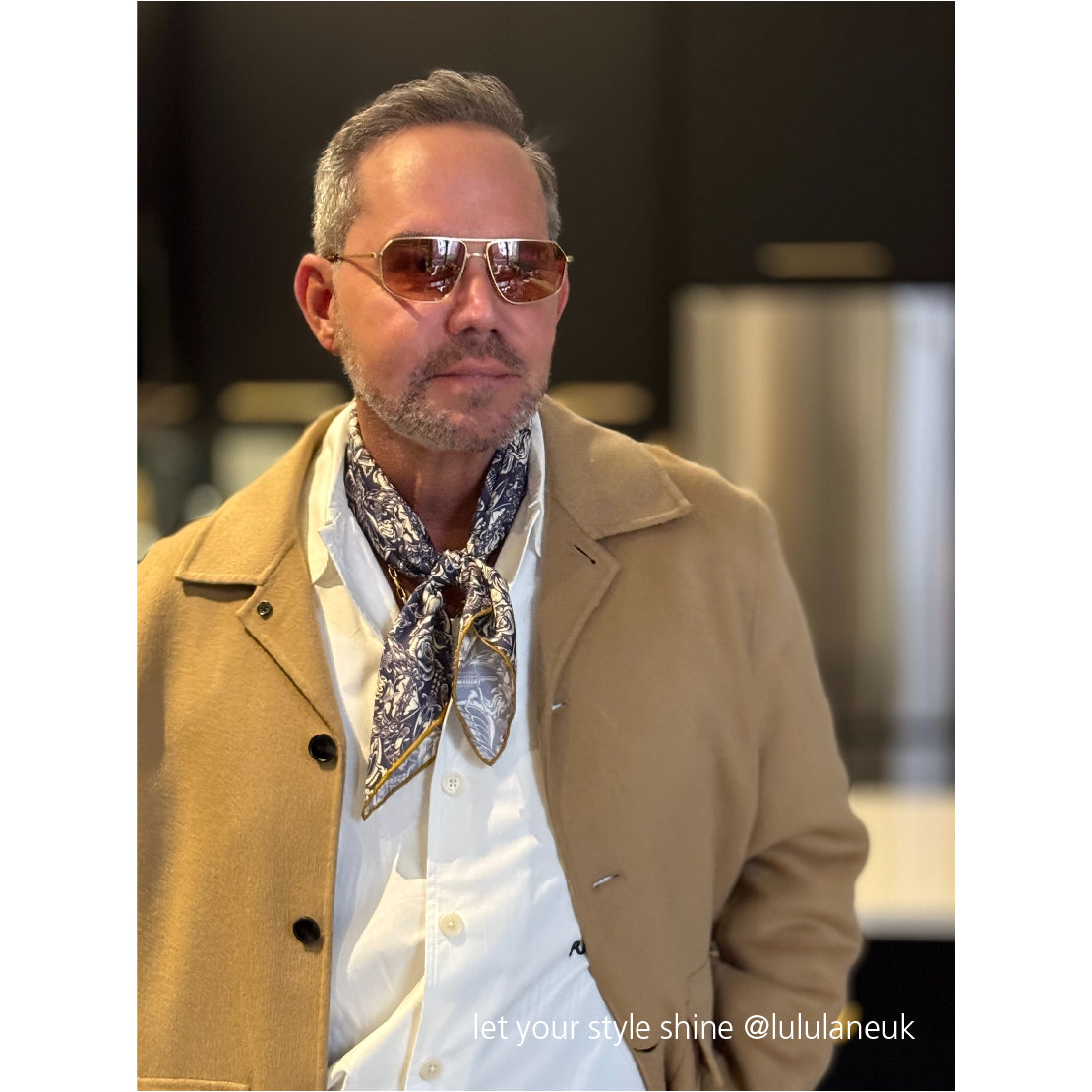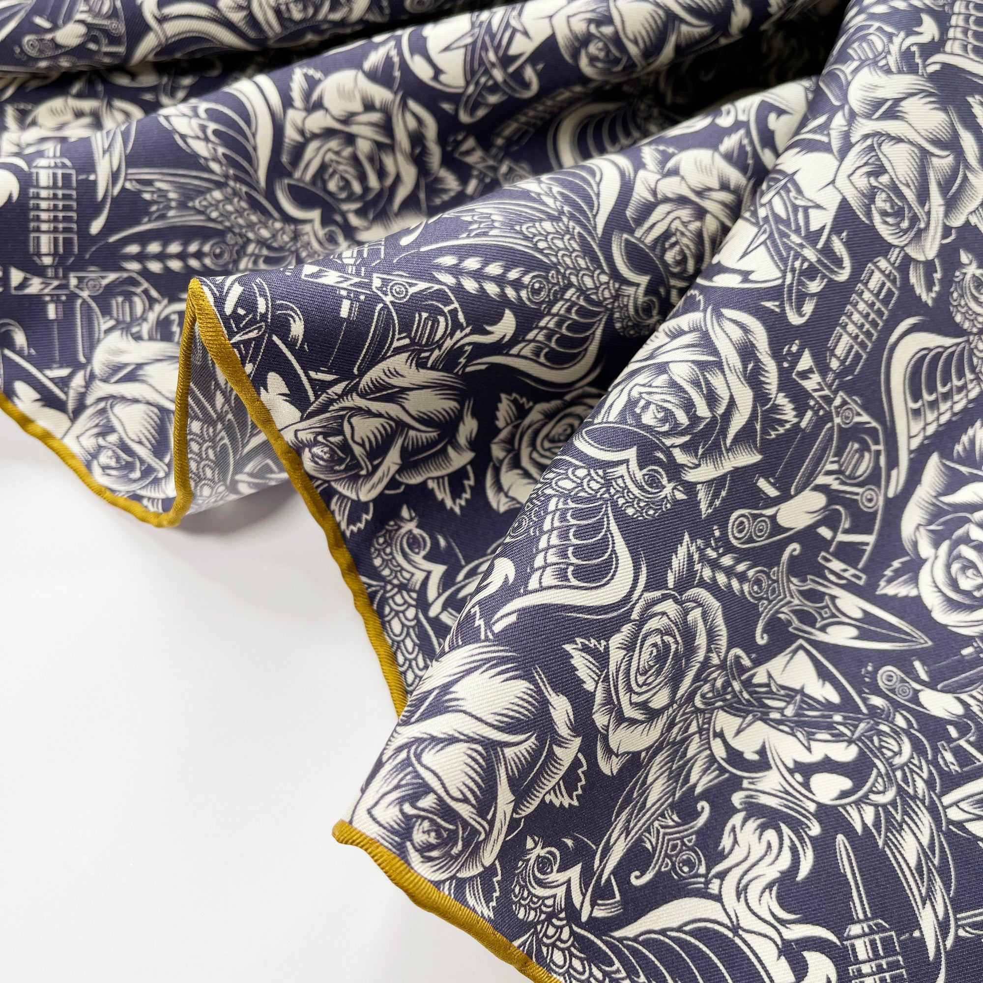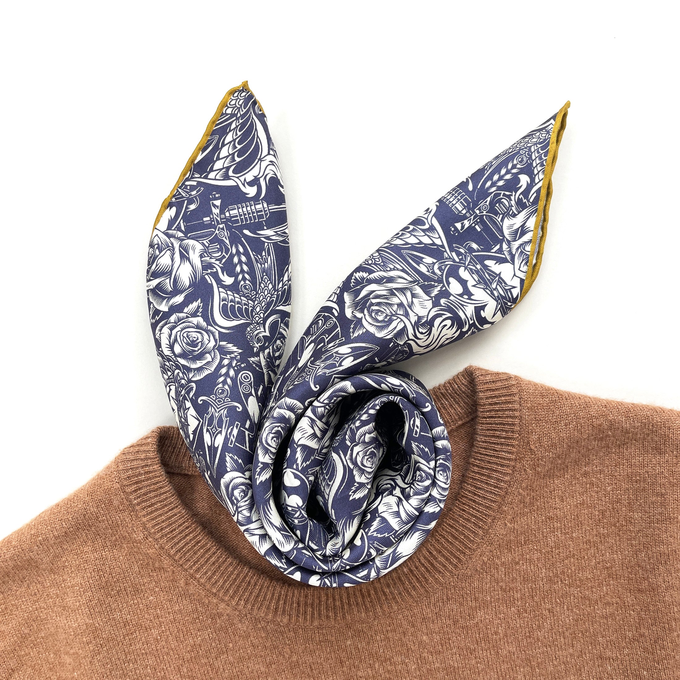 Elevate your style with our Retro Rose Silk Square Scarf—a luxurious accessory featuring a timeless rose print on a rich blue background, beautifully framed by mustard yellow hand-rolled hems. Perfectly designed for the discerning gentleman, this silk neckerchief brings a refined, vintage charm and sophistication to any outfit. Versatile, unique, and comfortable, it seamlessly blends elegance with a touch of retro flair for your everyday wear.