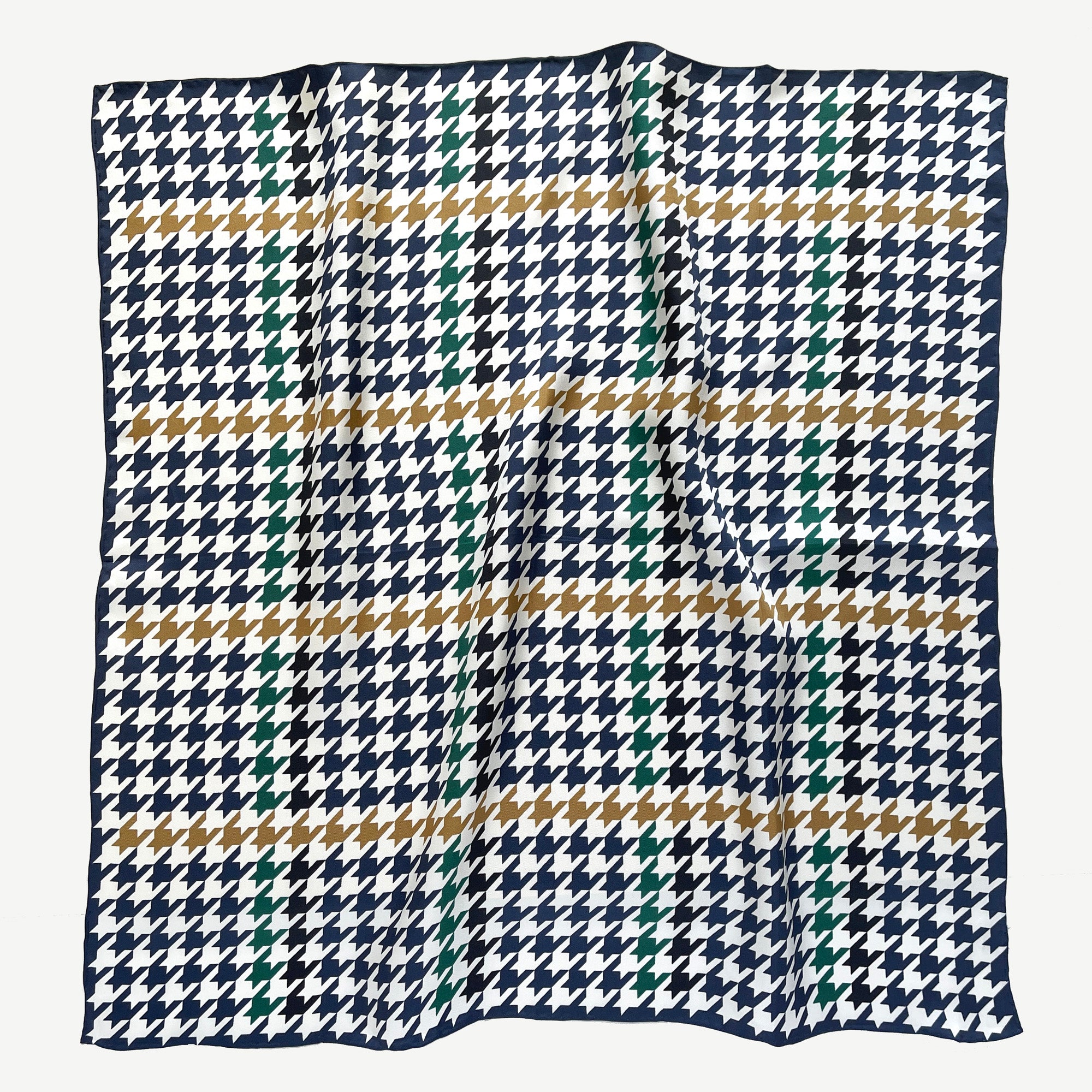 Elevate your wardrobe with this luxurious 100% silk scarf, showcasing a timeless houndstooth pattern accented with navy, green, and gold. Designed for both men and women, this hand-rolled silk square blends heritage and modern elegance, making it a must-have for those who appreciate quality craftsmanship and sophisticated style.
