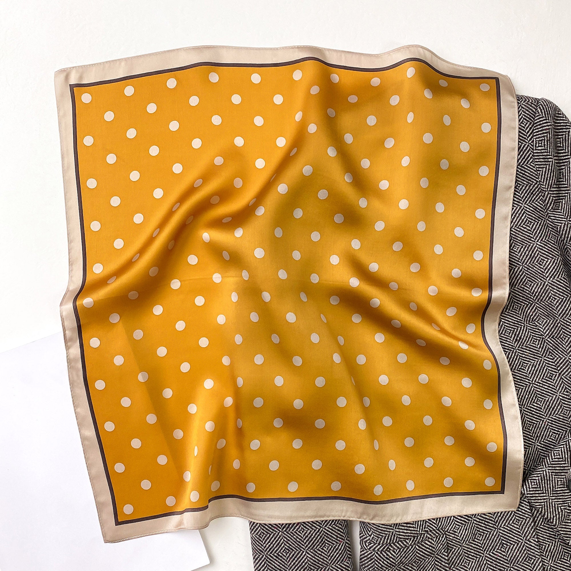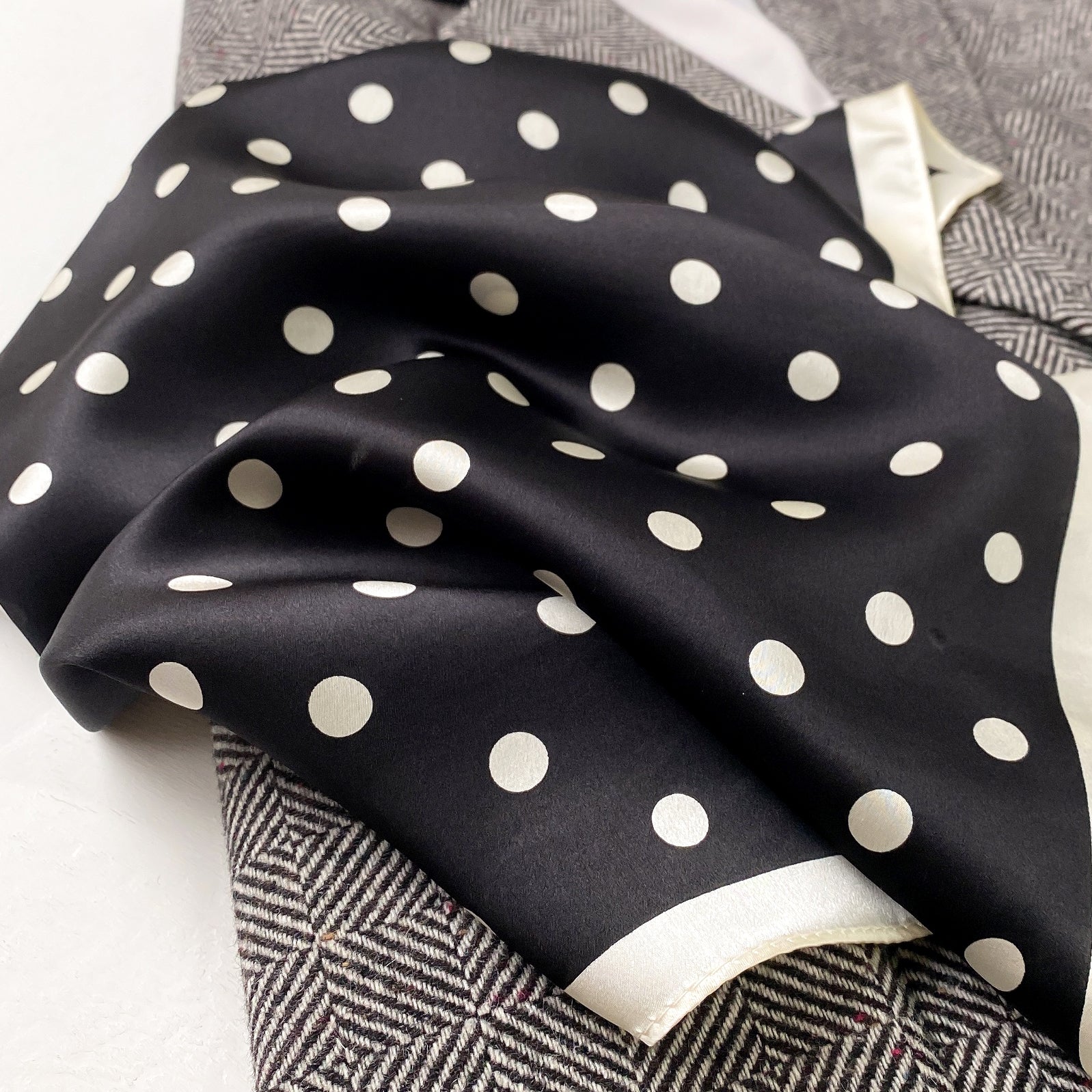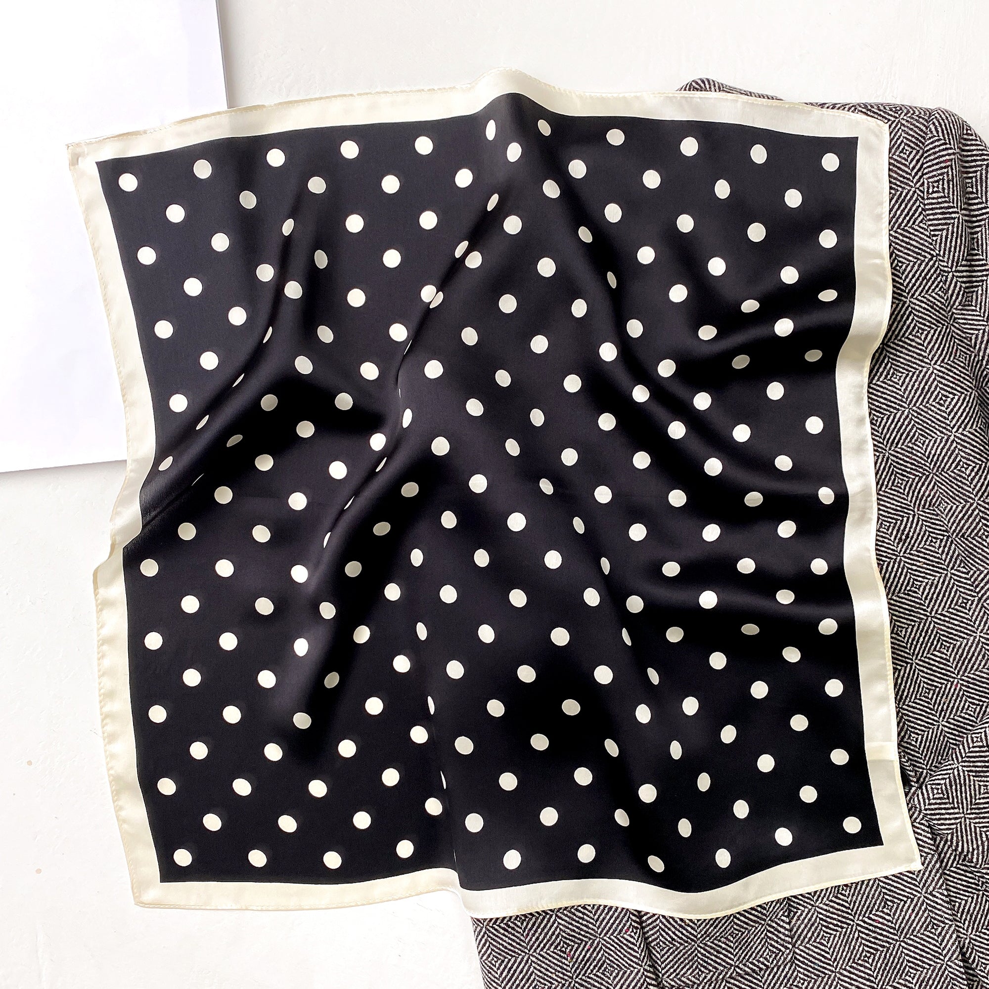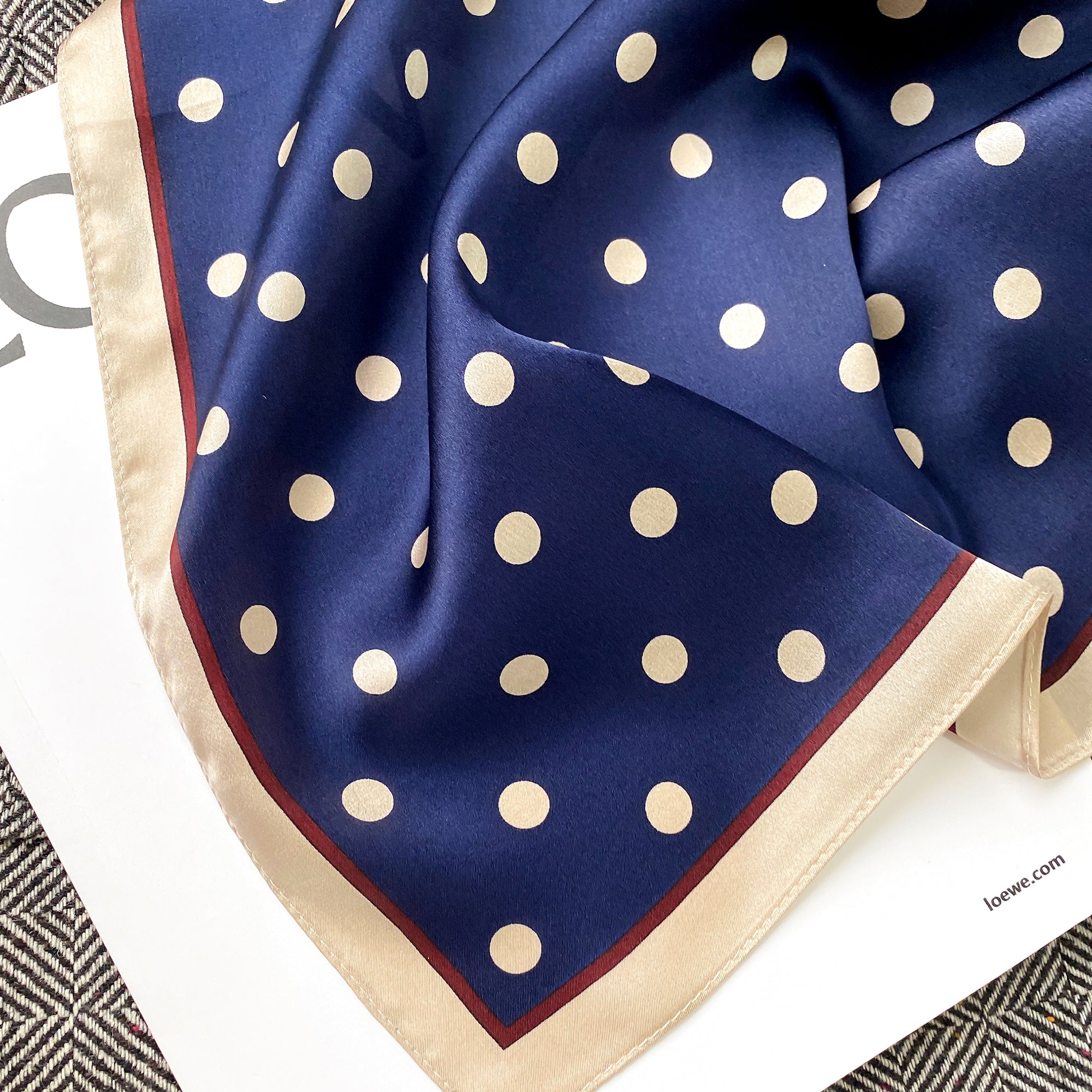 Introducing our timeless collection of classic polka dot silk bandana scarf, available in five stunning colors: navy blue, mustard yellow, champagne, white and black. Crafted from luxurious silk, this scarf envelops you in a cloud of pure indulgence, while the delicate polka dot pattern adds a playful yet refined charm. Wear it as a neckerchief for a classic and polished look, rock it as a headband, or tie it onto the strap of your handbag for a pop of colour and style.