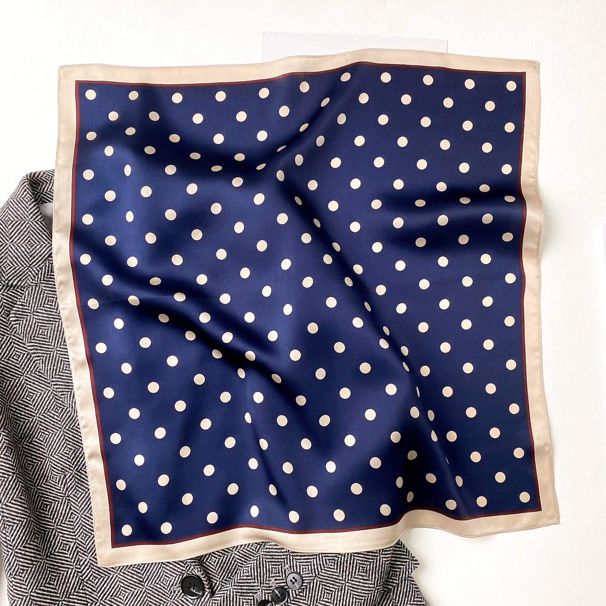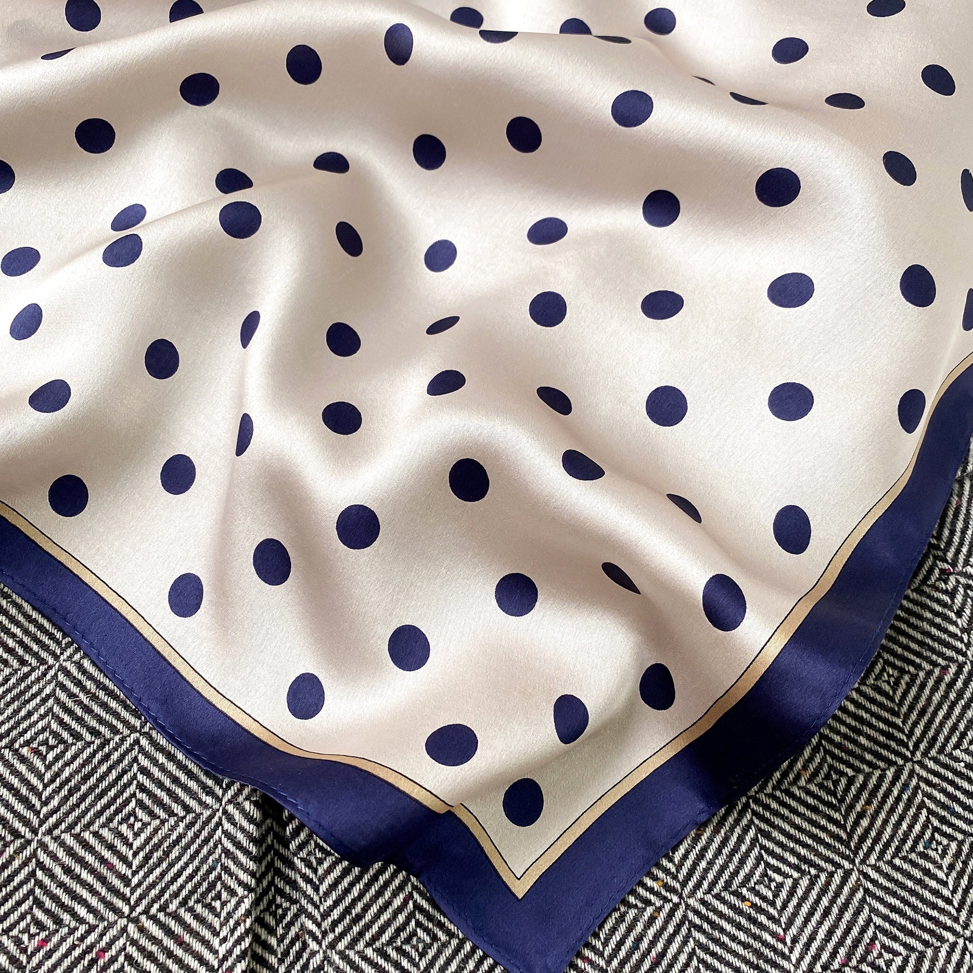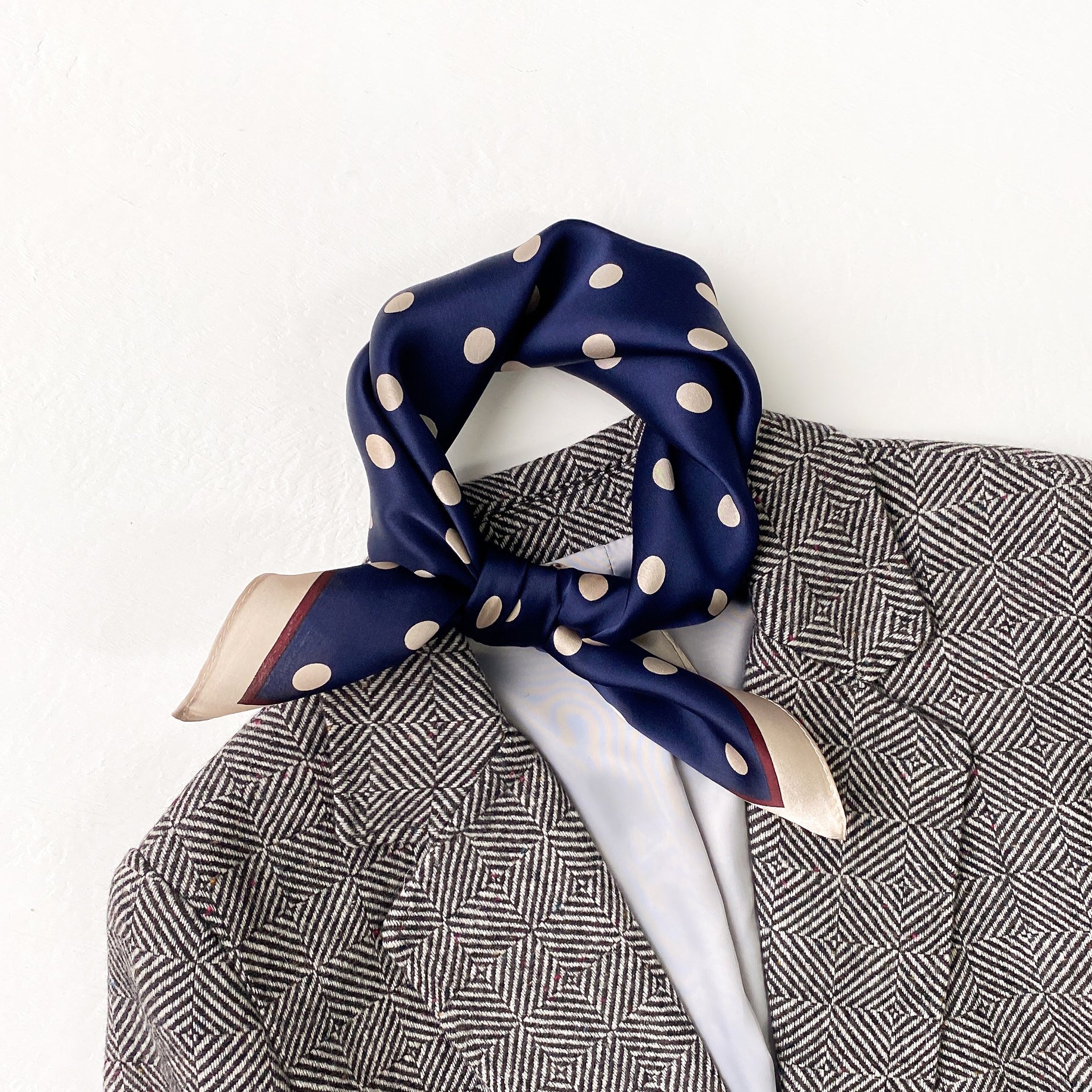 Introducing our timeless collection of classic polka dot silk bandana scarf, available in five stunning colors: navy blue, mustard yellow, champagne, white and black. Crafted from luxurious silk, this scarf envelops you in a cloud of pure indulgence, while the delicate polka dot pattern adds a playful yet refined charm. Wear it as a neckerchief for a classic and polished look, rock it as a headband, or tie it onto the strap of your handbag for a pop of colour and style.