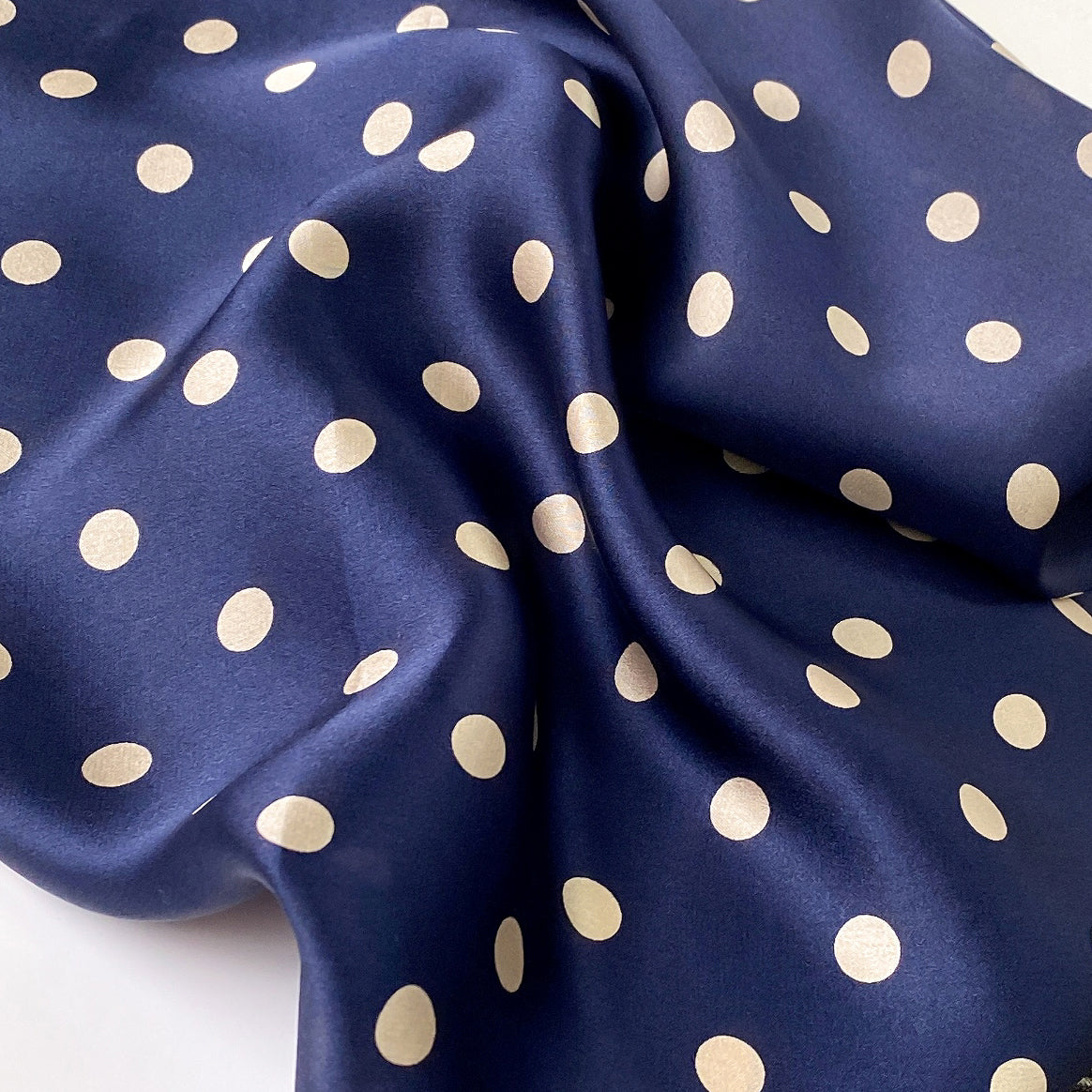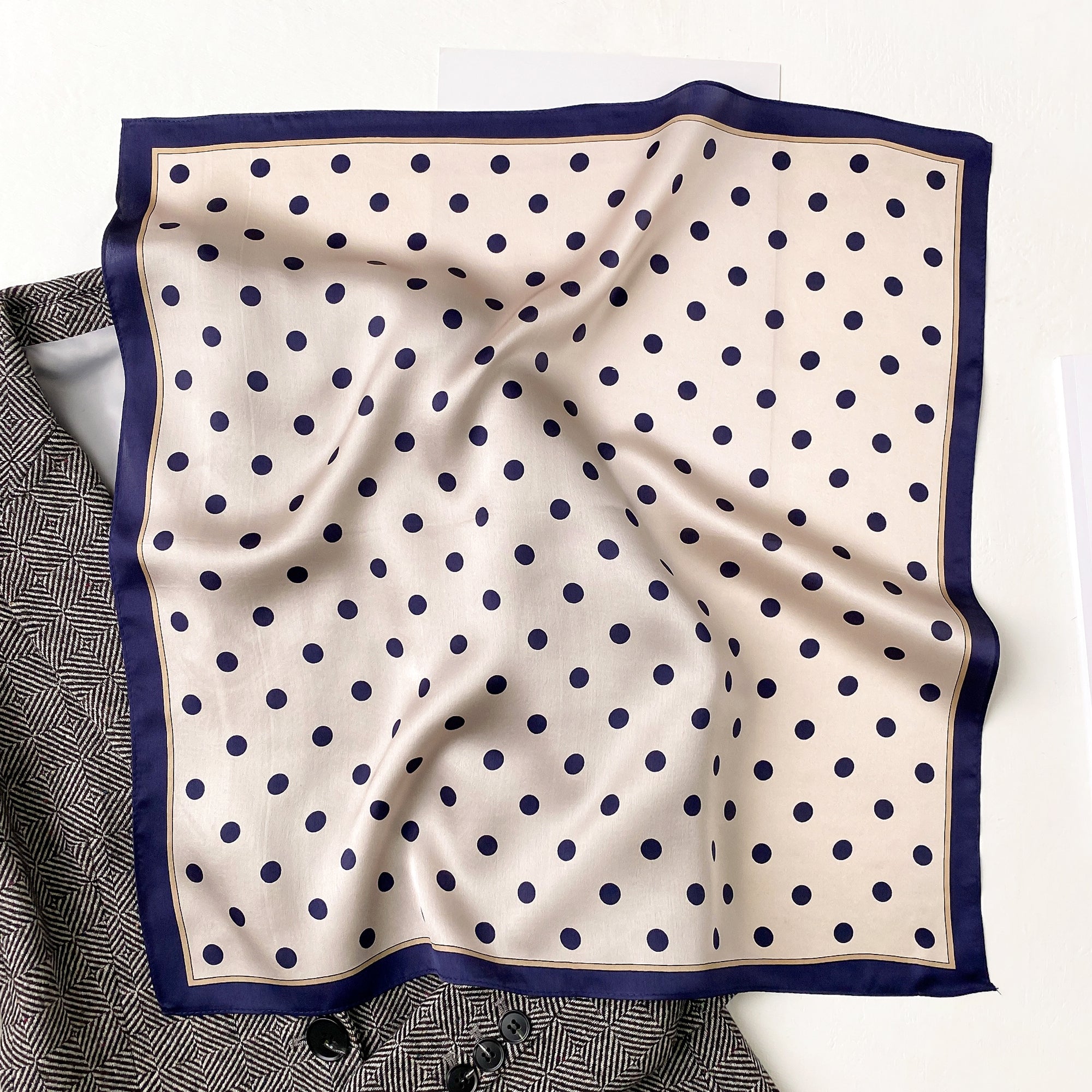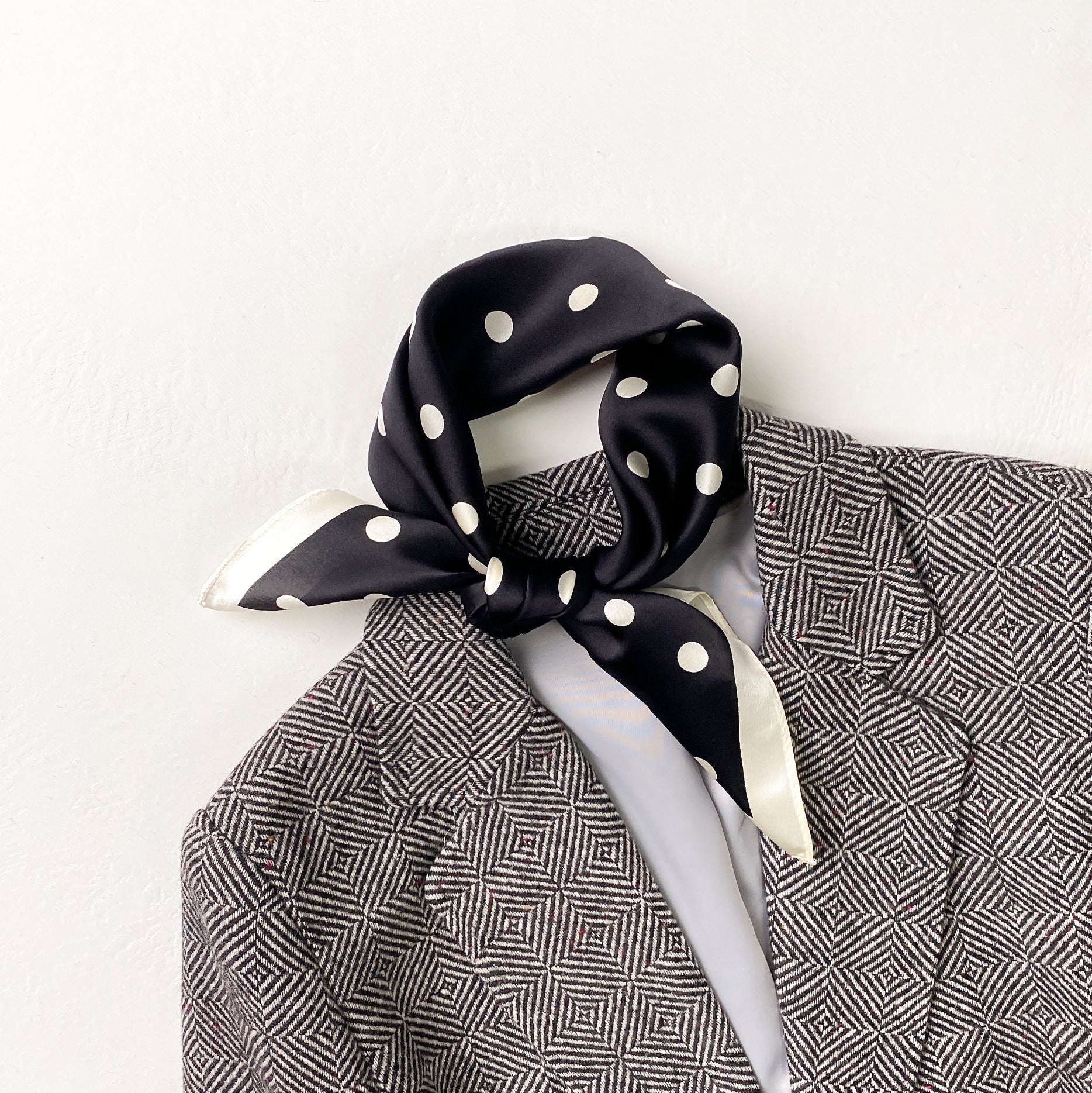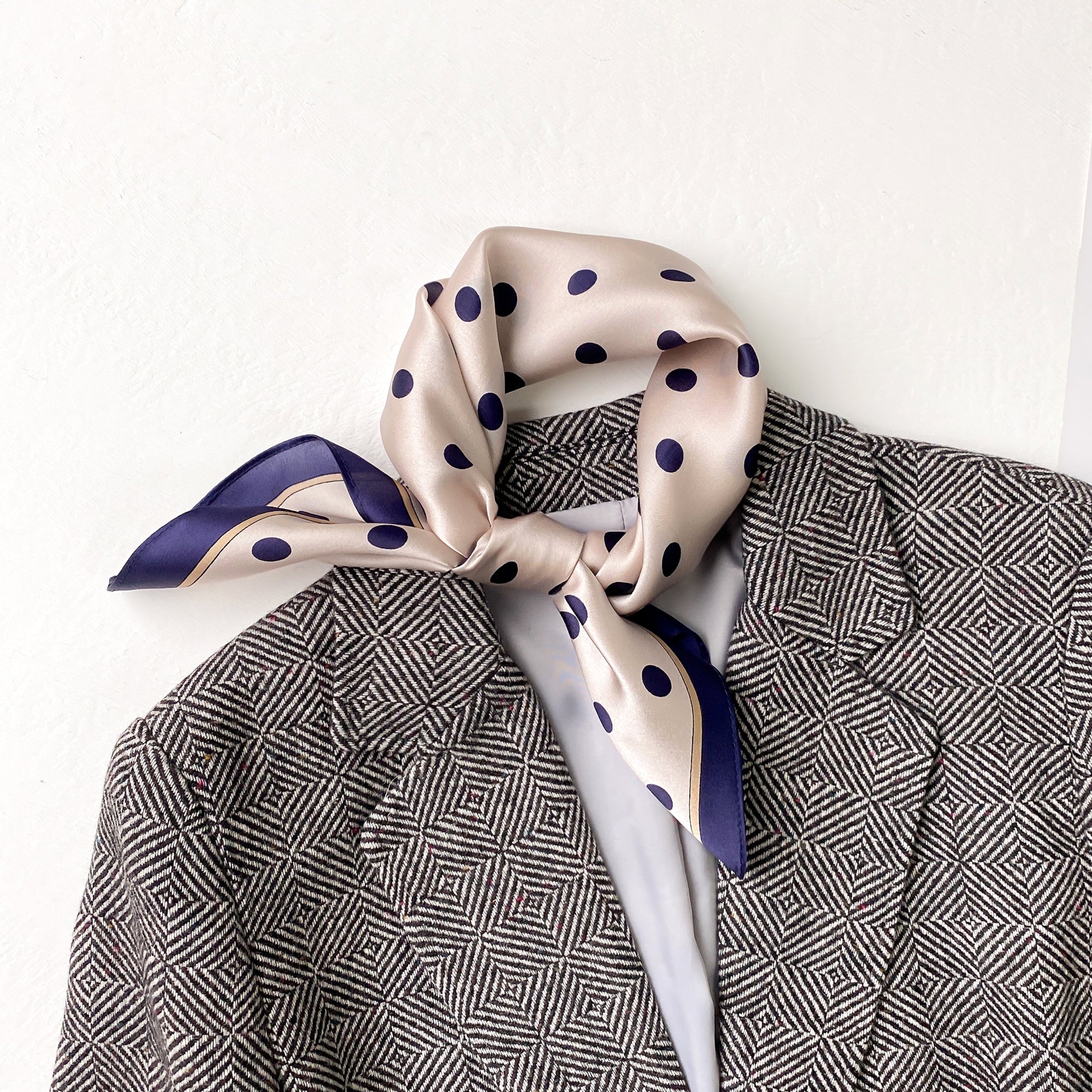 Introducing our timeless collection of classic polka dot silk bandana scarf, available in five stunning colors: navy blue, mustard yellow, champagne, white and black. Crafted from luxurious silk, this scarf envelops you in a cloud of pure indulgence, while the delicate polka dot pattern adds a playful yet refined charm. Wear it as a neckerchief for a classic and polished look, rock it as a headband, or tie it onto the strap of your handbag for a pop of colour and style.